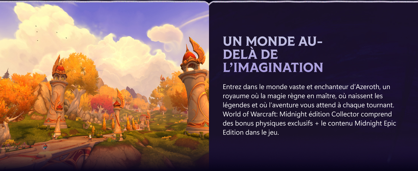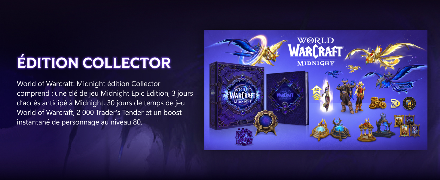 1Disponible le 30 juin 2026 au plus tard. Nécessite du temps de jeu ou un abonnement à World of Warcraft. 2Les extensions futures du jeu ne sont pas incluses avec l’achat de WoW®: Midnight™. Si vous avez déjà The War Within sur votre compte, vous ne recevrez pas l’extension une nouvelle fois. 3Objets en jeu et Sésame amélioré pour le niveau 80 non disponibles dans les jeux World of Warcraft® Classic. 4Les 3 jours d’accès anticipé à Midnight peuvent être impactés par les dates d’expédition et sont susceptibles d’être modifiés. Pour une durée limitée seulement. Temps de jeu réel sous réserve d’éventuelles perturbations ou de différences de fuseaux horaires. Certaines fonctionnalités de Midnight ne seront pas disponibles pendant la période d’accès anticipé. 5Si vous souhaitez profiter des objets numériques de Midnight et de tout accès au jeu disponible avant la réception de votre édition collector, vous pouvez acheter Midnight sur la boutique Battle.net. Si vous achetez Midnight (Base, Heroic, ou Epic) sur la boutique Battle.net, puis que vous activez un code de l’édition collector plus tard, votre porte-monnaie Battle.net sera automatiquement crédité du coût de votre achat numérique original, tant que vous activez le code de l’édition collector avant le 31 décembre 2026. Si vous avez acheté un produit de mise à niveau (par ex. : de la Base Edition vers l’Epic Edition), votre porte-monnaie Battle.net ne sera pas automatiquement crédité du coût de cette mise à niveau. Vous pouvez contacter l’assistance clientèle de Blizzard par l’intermédiaire de Battle.net pour demander un remboursement de votre produit de mise à niveau.
