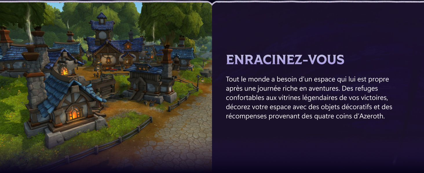 Cependant, même ici, l’aventure vous retrouvera. De temps en temps, vous y retrouverez des visages familiers qui vous conteront leurs histoires et vous confieront des missions, vous entraînant aux quatre coins d’Azeroth en quête de vestiges de leurs passés. Neuf groupes de visiteurs et visiteuses seront en rotation, et il sera impossible de déterminer à l’avance qui vous rendra visite la prochaine fois. Redécouvrez des endroits familiers sous un nouvel angle pour obtenir des récompenses et ajouter un charme cosmopolite à la taverne et à votre logis.