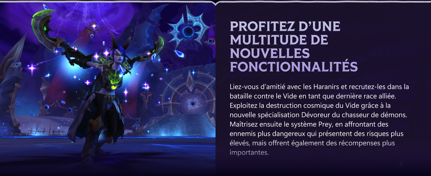 Avec l’arrivée de l’alpha, nous voulions vous donner un aperçu de la troisième spécialisation pour chasseur et chasseuse de démons : Dévoration, la nouvelle spécialisation DPS qui utilise la magie du Vide pour offrir un gameplay novateur. La spécialisation Dévoration possède des mécaniques de gameplay uniques qui varient en fonction de votre spécialisation et de vos talents héroïques.