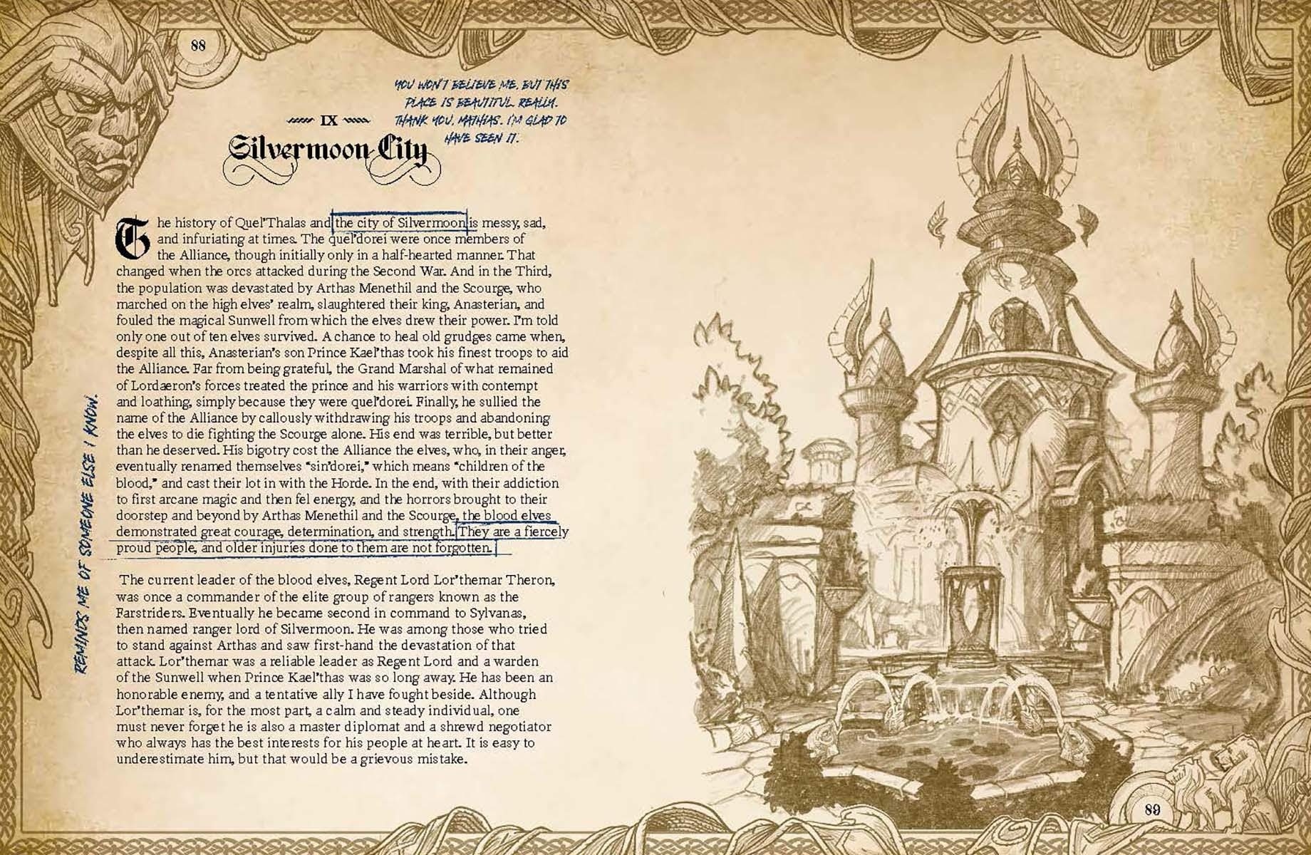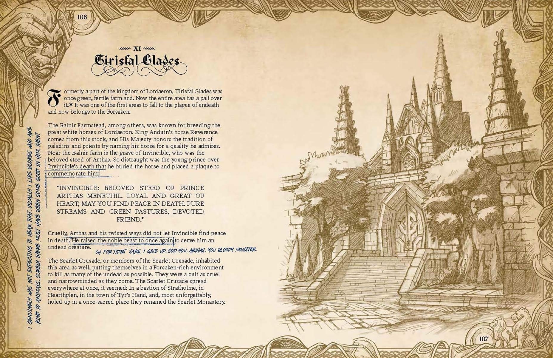 Comme vous pouvez le constater, chaque page possède sa propre illustration. Toutes semblent résumer leur sujet et y apporter des précisions par le biais d'évènements ou en parlant de personnages important. Par exemple, pour les Clairières de Tirisfal, la région nous est d'abord brièvement présentée, avant de parler d'Arthas, d'Invincible, de la Croisade Écarlate, ou même encore de la Ferme des Balnir.