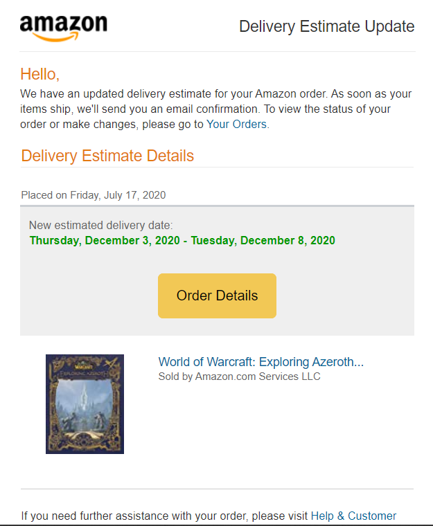 Décidément, l'ouvrage À la découverte d’Azeroth, écrit par Christie Golden et initialement prévu pour le 20 octobre 2020 puis décalé pour le 24 novembre, a été repoussé de nouveau pour le 3 décembre 2020.