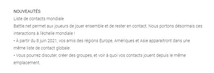 Le mardi 8 juin 2021, Blizzard a appliqué une mise à jour à l'application Battle.net, celle-ci visant vos listes de contacts. En effet, Blizzard a annoncé que vos amis des régions Asie, Europe et Amériques apparaissent désormais dans une seule même liste de contacts globale.