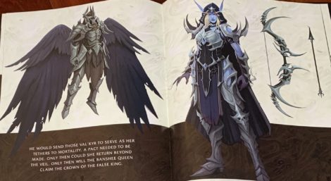 Sylvanas n'a pas un grand rôle dans ce livre, mais nous avons le concept art de sa nouvelle armure, associée à un Antrelige Val'kyr. Son pacte avec le Geôlier a commencé dans la nouvelle "À l'orée de la nuit", où elle a reçu des Val'kyrs comme protecteurs en échange de l'acceptation du marché du Geôlier. Cette histoire est évoquée dans la légende du concept art, qui réitère la nature protectrice du Val'kyr.