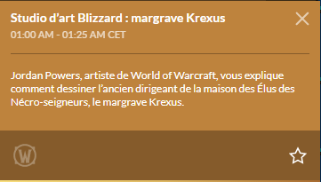 Pour terminer, ce 21 février, de 01h00 à 01h25 se déroulera le panel Studio d'art Blizzard : margrave Krexus, durant lequel Jordan Powers, artiste du jeu, vous expliquera comment dessiner l’ancien dirigeant de la maison des Élus des Nécro-seigneurs, le margrave Krexus.