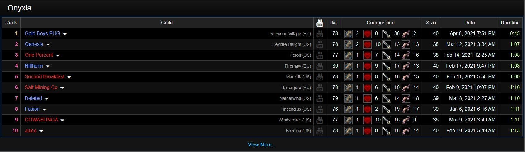 Gold Boys PUG, provenant du royaume européen Pyrewood Village. Celle-ci a en effet terrassé Onyxia en seulement 45 secondes, battant le record du monde de la victoire la plus rapide sur cette rencontre.