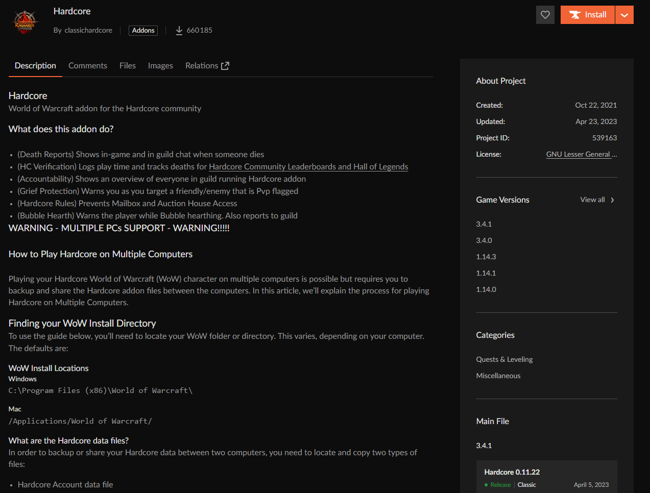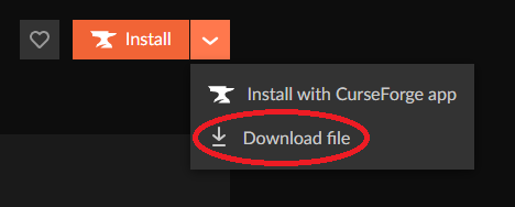 En premier lieu, téléchargez l'addon Hardcore depuis sa page dédiée sur le site web CurseForge. Pour se faire, cliquez sur la flèche blanche se situant à côté du bouton "Install", se trouvant lui-même en haut à droite de la page.