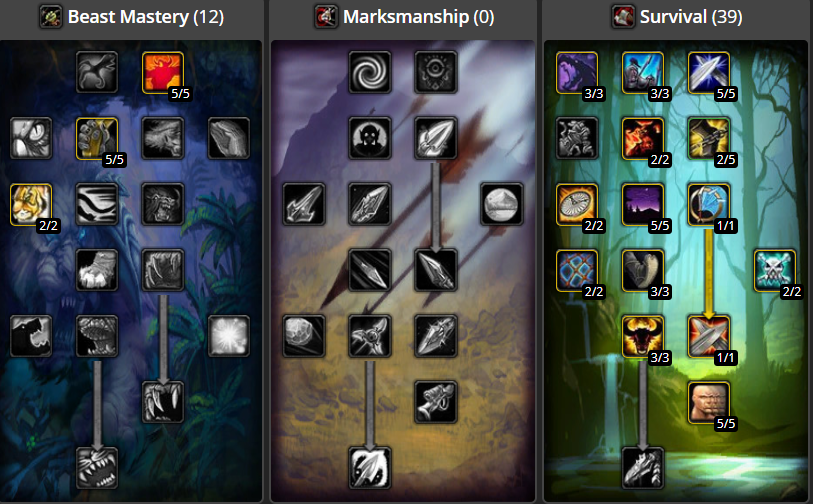 Vous pouvez voir ses arbres de talents ci-dessous. Nous constatons qu'il a énormément privilégié les talents de la spécialisation Survie.