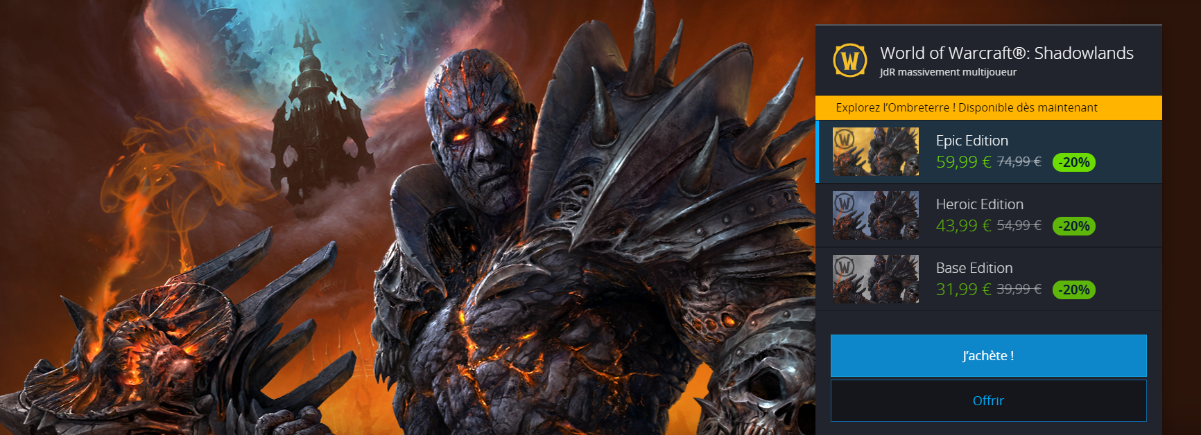 - Contenu de l'Édition de Base : tout le contenu de Shadowlands : coûte 31, 99 euros (au lieu de 39.99 euros).