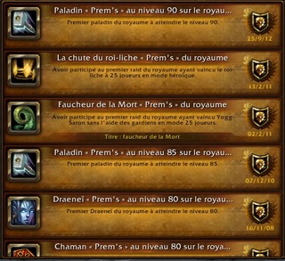 Sachez que Khayn réalise des progressions de niveaux fulgurantes depuis de nombreuses années. En effet, le joueur m'a partagé une capture d'écran d'un extrait de sa liste de hauts-faits, dans laquelle nous pouvons voir des hauts-faits "Premier du royaume" durant les extensions Wrath of the Lich King et Cataclysm.