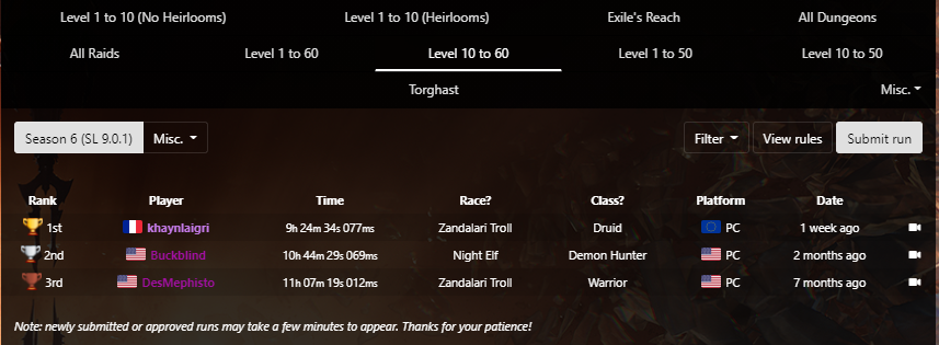 Récemment, en incarnant son personnage Troll Zandalari Druide, Khayn est parvenu à atteindre le niveau 60 en 9 heures, 24 minutes, 34 secondes et 77 millisecondes. Il s'agit d'un nouveau record mondial. Son objectif initial était d'évoluer jusqu'au niveau maximal en moins de 10 heures. Ainsi, Khayn a progressé dans les zones de contenu de Vanilla jusqu'au niveau 30, puis en Draenor jusqu'au niveau 46, avant de réaliser le contenu de l'extension Battle for Azeroth peu après. Khayn était accompagné de quelques amis : ensemble, ils ont essayé la synchronisation de groupe au niveau 46, mais cela ne leur rapportait pas assez de points d'expérience et ont décidé d'évoluer en Nazmir, la zone de Zandalar.