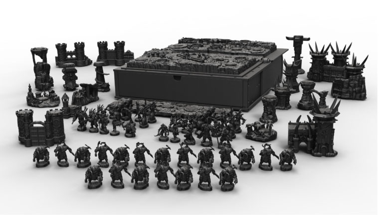 Le plateau de jeu, ou coffre-fort, a été conçu par Edge Toy, qui a créé des designs pour des attractions de parcs à thème, des animatronics et bien d'autres pour des sociétés comme Lucasfilm et Disney. Les figurines minutieusement modélisées comprennent des dirigeants de la Horde et de l'Alliance, ainsi que des créatures et des éléments modulaires conçus pour permettre des environnements de la Horde et de l'Alliance visuellement détaillés. Imprimé en résine, et magnifiquement détaillé, chaque pièce est un objet de collection aussi approprié pour l'exposition que pour le jeu.