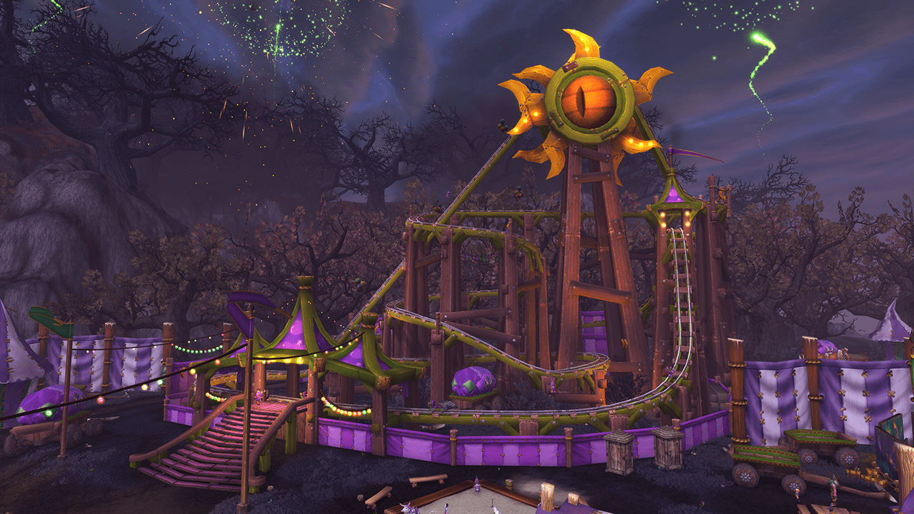 Voilà tout simplement les montagnes russes les plus longues, les plus hautes et les plus rapides de tout Azeroth ! Accrochez-vous à votre siège et laissez-vous décoiffer par un flot de virages serrés et de descentes vertigineuses. La taille minimum requise ? Il n’y en a pas… Tout le monde pourra en profiter, même les Nains, les Gnomes et les Gobelins ! Les joueurs suffisamment intrépides pour s’y frotter gagneront l’amélioration WOUHOU !, qui augmente les gains d’expérience et de réputation pendant une heure. Ils pourront ainsi mettre à profit ce bonus pour obtenir de nouvelles armures ancestrales ou déverrouiller des races alliées, comme les nouveaux Vulpérins et Mécagnomes.MANÈGE DE SOMBRELUNE