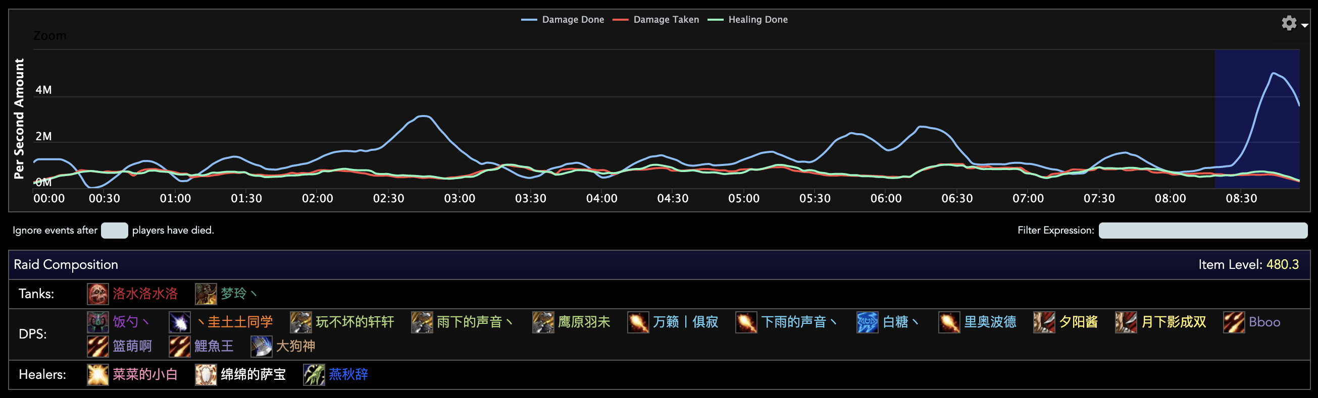 Voici les logs du combat (nous observons qu'ils ont stacké 3 Démonistes spécialisés dans la Destruction, 3 Mages spécialisés dans le Feu et 3 Chasseurs spécialisés dans la Maîtrise des Bêtes) :