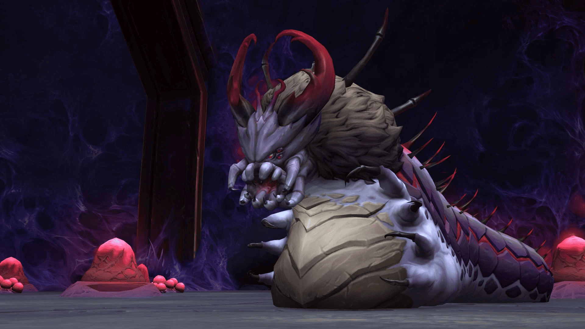 Dans les profondeurs obscures sous le palais des Nérub’ar, le sang des Dieux très anciens coagule pour former de sombres bassins infâmes. L’horreur liée par le sang émerge de cette sanie infâme et entraîne tout ce qu’elle croise vers l’Invisible.