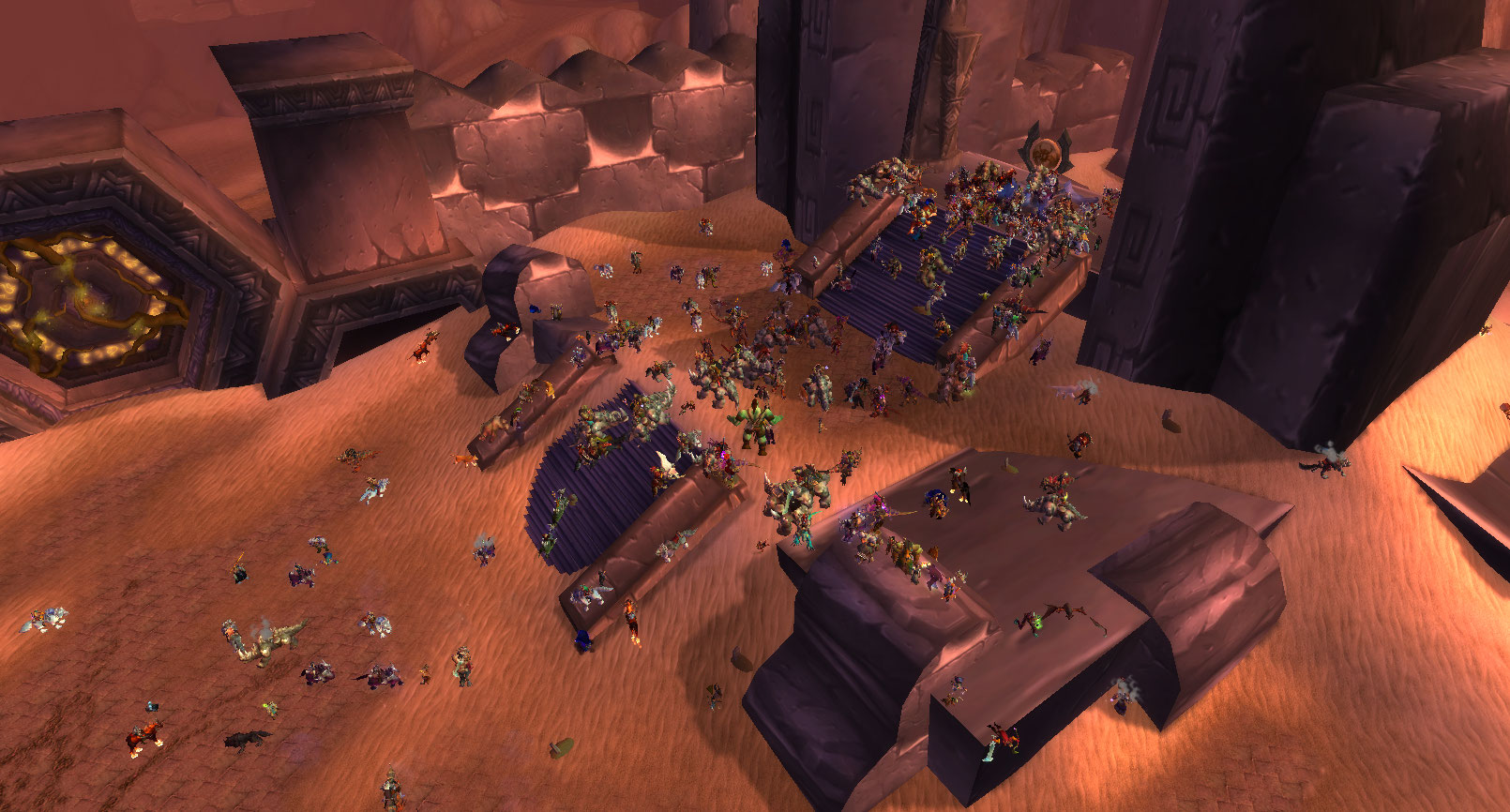 Pour remédier à ce problème, nous avons choisi d’utiliser des layers, des copies de régions entières (les royaumes de l’Est, par exemple) destinées à réguler la population de joueurs et les problèmes de latence tout en conservant le charme mémorable du jeu original, afin que les joueurs puissent continuer d’attirer les boss hors instance d’une zone à l’autre et pourchasser les joueurs adverses au-delà des frontières d’une région sans risquer d’être réassignés à un shard différent. Cela étant dit, les layers ont été pensés comme une solution temporaire. La version 1.12 originale n’utilisait ni sharding, ni layering ; nous avons donc promis aux joueurs que nous n’utiliserions les layers qu’au lancement de WoW Classic et que ceux-ci disparaîtraient progressivement une fois les utilisateurs mieux répartis entre les différentes zones du jeu. Nous continuons d’utiliser le layering dans quelques cas particuliers où les joueurs sont extrêmement nombreux (sur Faerlina en Amérique du Nord, par exemple), mais nous avons réduit le nombre de layers actifs sur ces royaumes depuis la sortie du jeu. Quinze ans après les évènements originaux, la guerre d’Ahn’Qiraj est l’un des évènements les plus attendus de WoW Classic, et nous nous attendions à battre des records d’affluence dans une même zone (en dehors des zones de départ à la sortie du jeu), et tout cela sans layers pour gérer la situation. Sans les technologies de layering et de sharding, nous avons dû faire preuve de créativité, et vite.