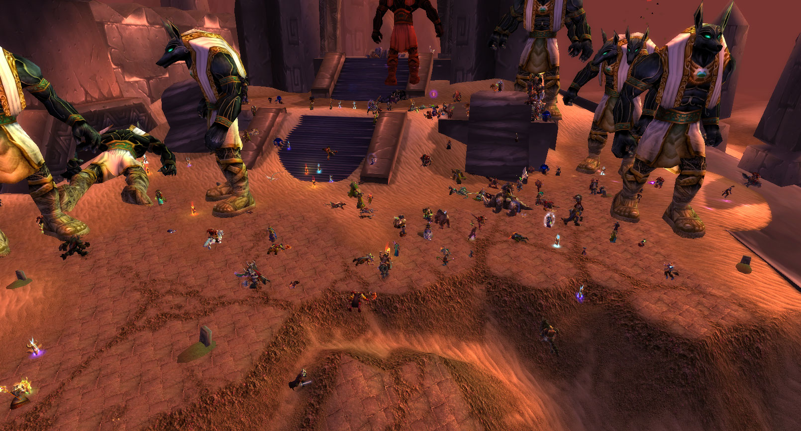 Au-delà de la nécessité d’optimiser les serveurs pour accueillir plus de joueurs dans chaque zone, il ne nous a pas échappé qu’il serait impossible de faire tenir la population d’un royaume entier (plus du double de la population d’un royaume de la version 1.12 du World of Warcraft original) dans la région de Silithus. Il a fallu prendre des décisions difficiles et limiter l’accès à la zone à certaines catégories et un certain nombre de joueurs. Nous avons décidé de n’accueillir que les personnages de niveau 60 en Silithus et de cesser de faire entrer les personnages admissibles une fois la zone pleine. Cette restriction nous semblait judicieuse, car l’évènement de Silithus est du contenu de niveau maximum, et les personnages de plus faible niveau peuvent tout de même participer à l’effort de guerre dans d’autres zones, en tuant par exemple les Anubisath qui rôdent dans les Tarides, une zone destinée aux joueurs de niveau 20 à 30. D’autre part, nous savions combien de joueurs nous pouvions accueillir dans une zone sans faire planter le serveur, mais un point de friction demeurait : de combien réduire ce nombre pour atteindre le meilleur ratio performances/population ? Avec les tests, nous avons déterminé que ce nombre était d’environ 1 500 joueurs lorsque ceux-ci étaient regroupés. Toutefois, étant donné que l’évènement s’étend à toute la zone, nous n’avons constaté qu’un impact minime sur les performances une fois les joueurs dispersés.