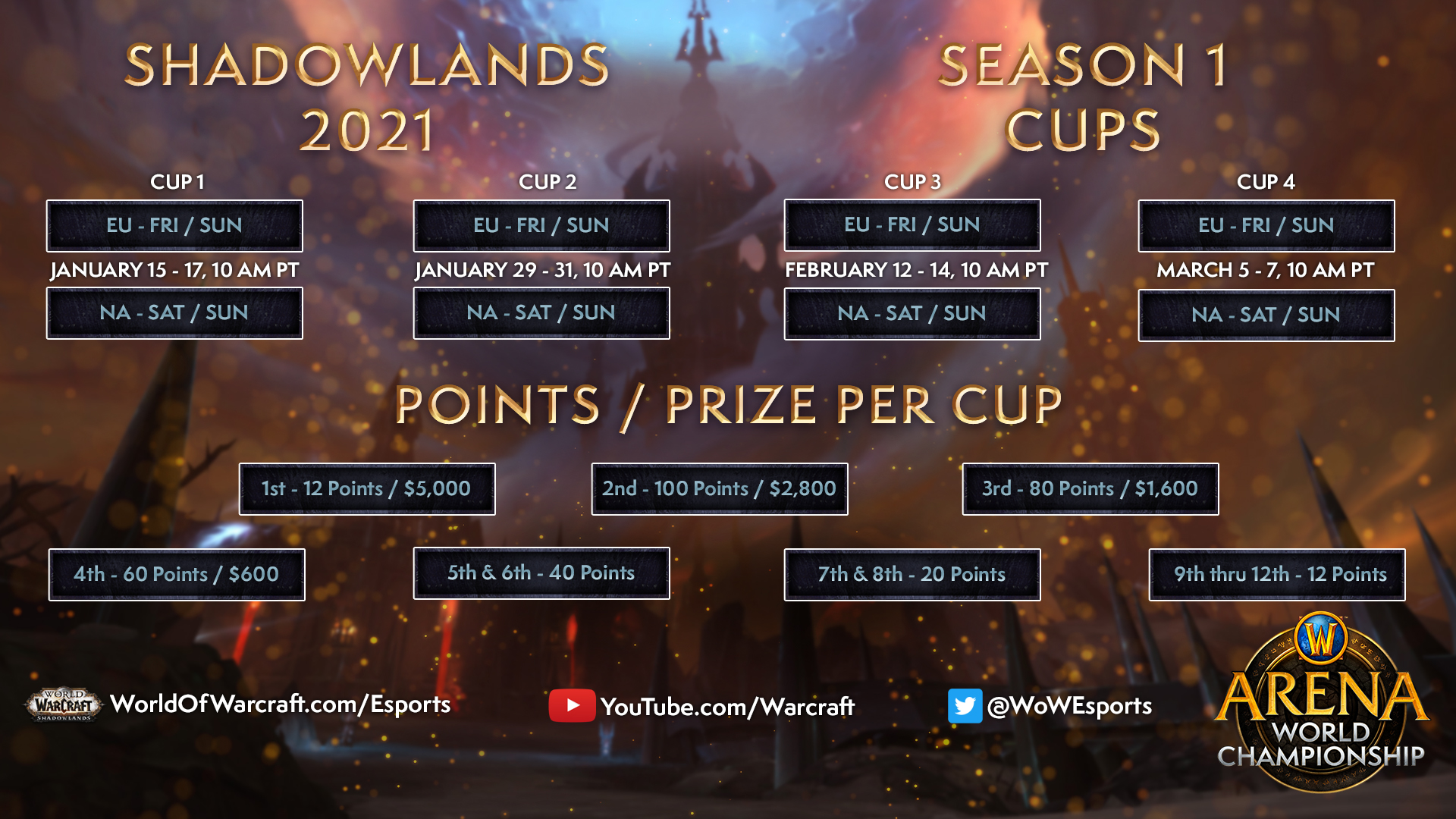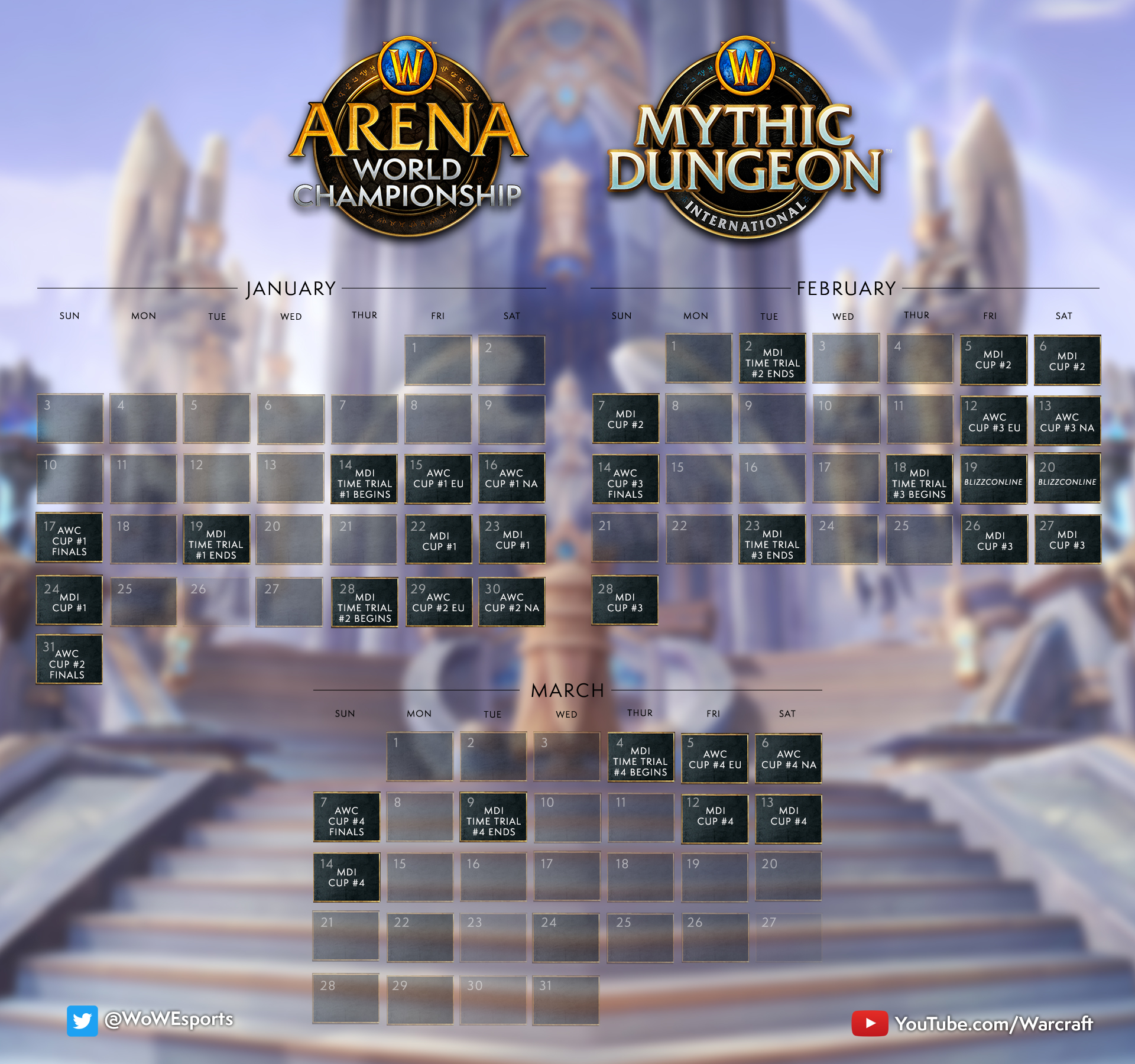 Les coupes du championnat du monde d’arène se dérouleront en parallèle de la saison 1 du Mythic Dungeon International, lors de week-ends organisés entre 2 évènements. Cela donnera plus de temps aux équipes de s’entrainer avant la prochaine coupe, elles pourront ainsi développer de nouvelles stratégies tout en améliorant le niveau global de la compétition.
