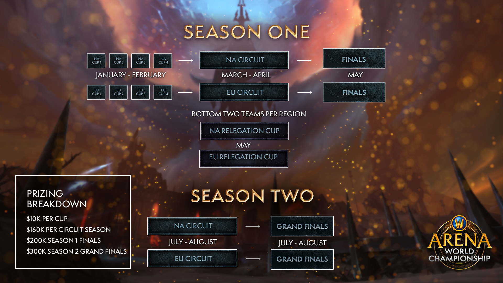 Blizzard a ainsi dévoilé la nouvelle édition du championnat du monde d’arène proposant deux saisons. La dotation de la saison 1 sera de 200 000 $ tandis que celle de la saison 2 sera de 300 000 $.