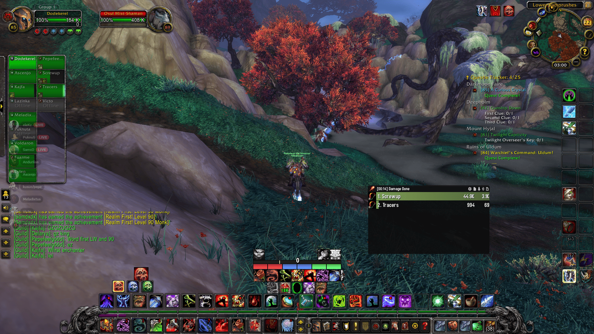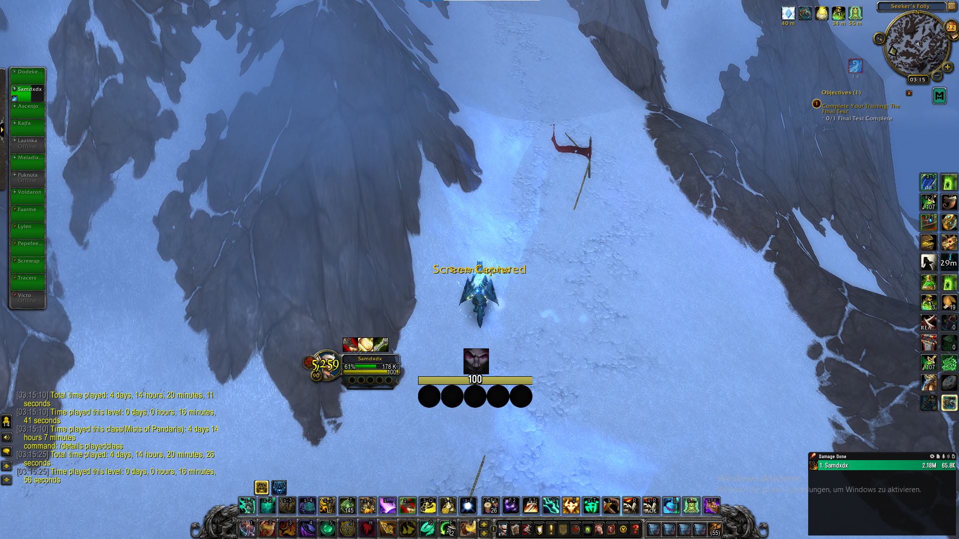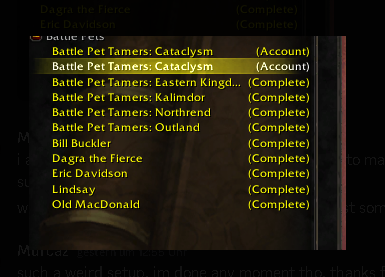 - Étape 3 (niveaux 88 à 90) : Bashing de créatures à Sra'vess, aux Steppes de Tanglong. Une fois le niveau 89 franchi, notre ami rend automatiquement, depuis son journal, des quêtes de combats de mascottes, qui, échelonnées à son niveau, lui ont instantanément gratifié 3 millions de points d'expérience.