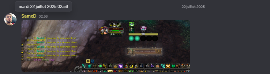 Mais avant d'entrer dans le vif du sujet, donc de vous expliquer clairement le chemin qu'il a suivi, prenons un peu de temps et penchons nous sur ce qui s'est produit avec Lmgd1 : alors qu'un grand nombre de personnes suivaient son stream sur Twitch (dont votre serviteur), où il montrait sa progression fulgurante (c'est le cas de le dire) et alors qu'il a atteint le dernier palier à 3 heures et 51 secondes (3:00:51) du matin, un nom a surgi sur le chat : Samdxdx. Ce joueur, selon certains spectateurs, aurait devancé Lmgd1 d'une courte tête (de 2 minutes et 22 secondes, pour être précis). Après un moment d'investigation, je vois apparaître, à la fois sur le serveur Discord de la guilde de Sam (que j'ai entre temps rejoint) et en réponse d'un post sur X, une à plusieurs captures d'écran prouvant son exploit. Celles-ci attestent de son tour de force :