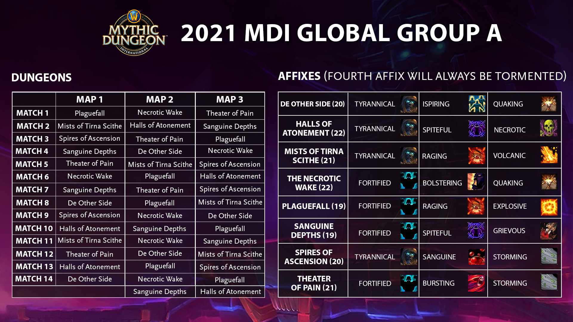 Les affixes et la difficulté des donjons de pierre mythique varieront d’un groupe à l’autre, et les équipes auront une semaine pour préparer leurs matchs. Voici les détails pour le groupe A ce week-end.