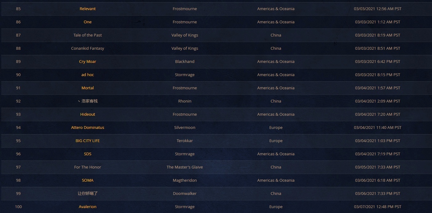Avec cette action réalisée par Blizzard, de nouvelles guildes ont pris la place des guildes chinoises retirées du Panthéon du Château Nathria, suivant l'ordre dans lequel elles ont tué Sire Denathrius. La première guilde à s'être incluse est "Relevant" du royaume Frostmourne, en Amérique du Nord.