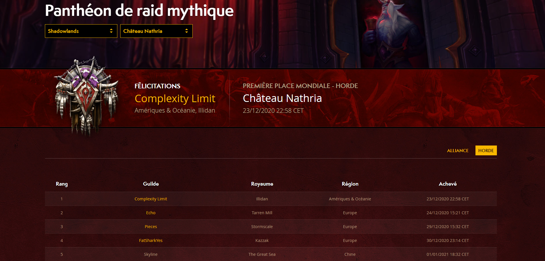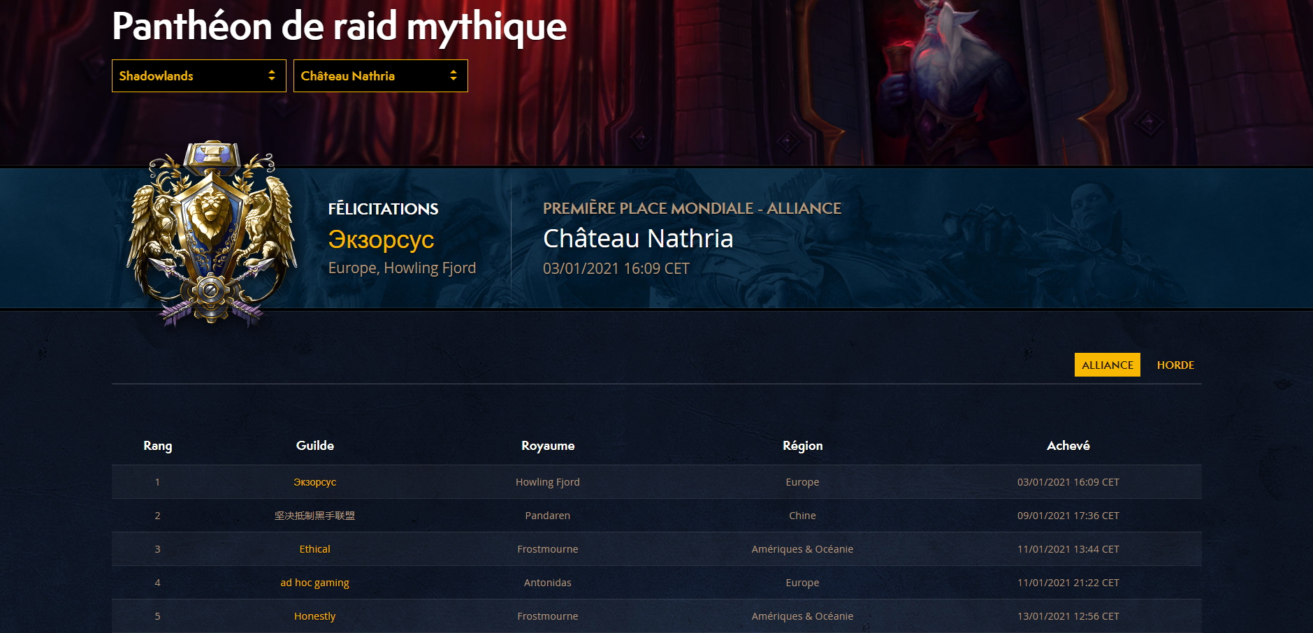 Alliance, seules 15 guildes ont vaincu Sire Denathrius en mode Mythique, depuis l'ouverture de cette difficulté du raid en décembre dernier. Ainsi, 85 guildes doivent éliminer le dernier boss pour que le tour de force et le Panthéon soit indisponible dans cette faction, et pour que le mode Mythique arrive en interserveur.