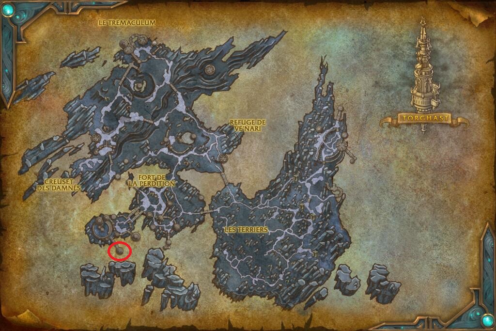 Cette forge est placée sur une plateforme qui surplombe la créature rare "Exos, héraut de la domination". La prise de grappin pour atteindre la forge de l'âme est située sur la plateforme derrière Exos aux coordonnées 20,2 ; 67,0. Une fois que vous êtes monté sur la plateforme la plus élevée, l'enclume se situe aux coordonnées 20,2 ; 67,0.