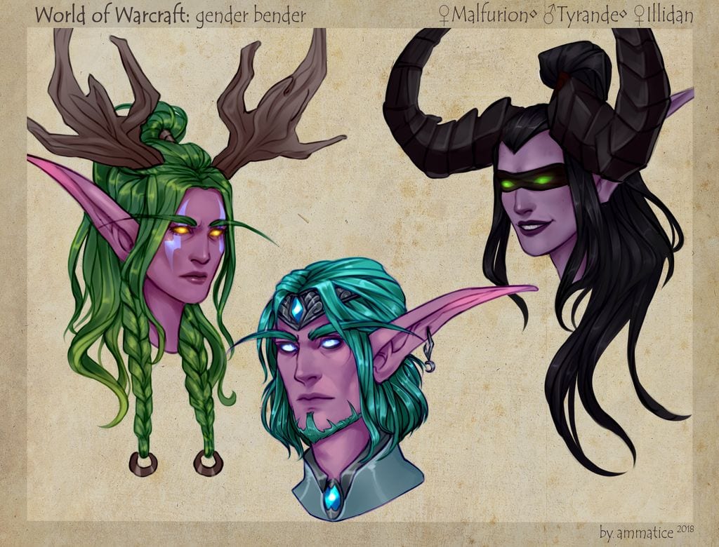 (Illustration N°4 représentant Malfurion en femme / Tyrande en homme / Illidan en femme)