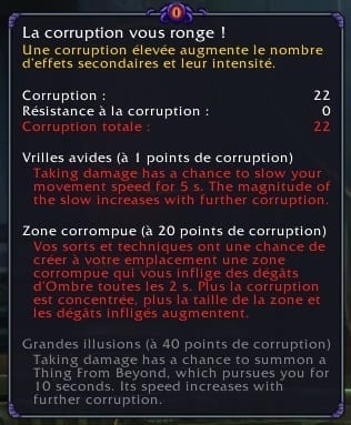- Voici les différentes modifications des malus de corruption: 1+ de Corruption - Vrilles avides : Prendre des dégâts à une chance de ralentir votre vitesse de déplacement pendant 5 secondes. L'ampleur du ralentissement augmente avec davantage de corruption. 20+ de Corruption : Zone corrompue : Vos sorts et techniques ont une chance de créer à votre emplacement une zone corrompue qui vous inflige des dégâts d'Ombre toutes les 2 secondes. Plus la corruption est concentrée, plus la taille de la zone et les dégâts infligés augmentent. 40+ de Corruption : Grandes illusions : Prendre des dégâts à une chance d'invoquer une Chose venue d'en-bas qui vous poursuit pendant 10 secondes. Sa vitesse augmente avec davantage de corruption. 60+ de Corruption : Cascading Disaster : Si vous êtes touché par une Chose venue d'en-bas, vous serez immédiatement affecté par Vrilles avides et Zone corrompue. 80+ de Corruption : Creeping Death : Tous les dégâts subits sont amplifiés de manière significative et augmentent avec davantage de corruption.