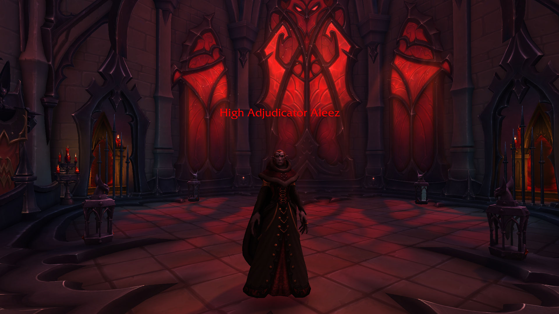 Entre les murs des salles de l’Expiation, par-delà la cour et les gargouilles, se trouve une église bien différente de toutes celles d’Azeroth. La grande adjudicatrice Alize y préside une congrégation d’esprits chargés de prêcher le sombre dogme de sire Denathrius aux indignes.