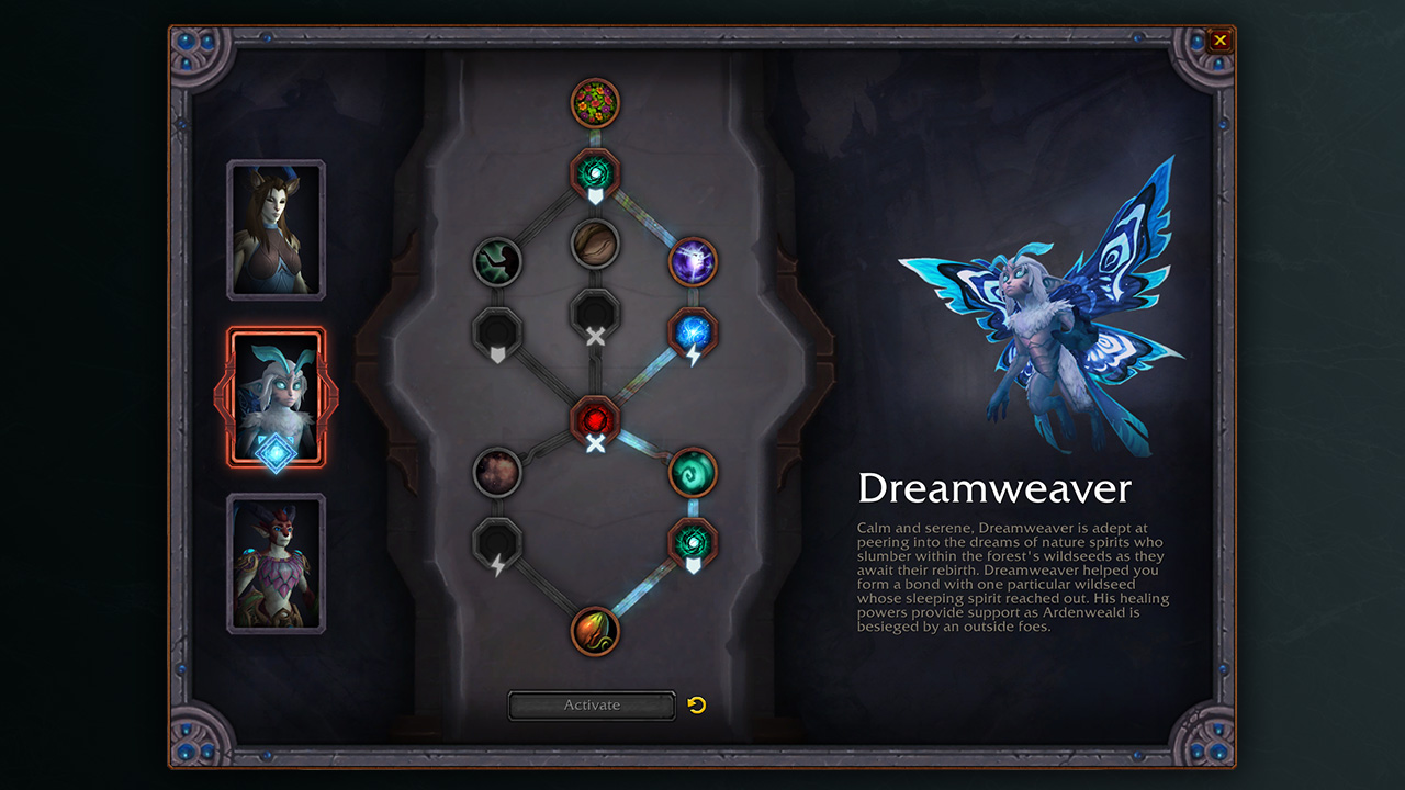 Tisse-Rêves est une fée calme et sereine qui explore les rêves des esprits de la nature qui sommeillent dans les graines sauvages de la forêt en attendant leur renaissance. Tisse-Rêves vous a aidé à établir un lien avec une graine sauvage en particulier, dont l’esprit en sommeil cherchait à vous parler. Ses pouvoirs guérisseurs soutiennent Sylvarden face aux forces extérieures.