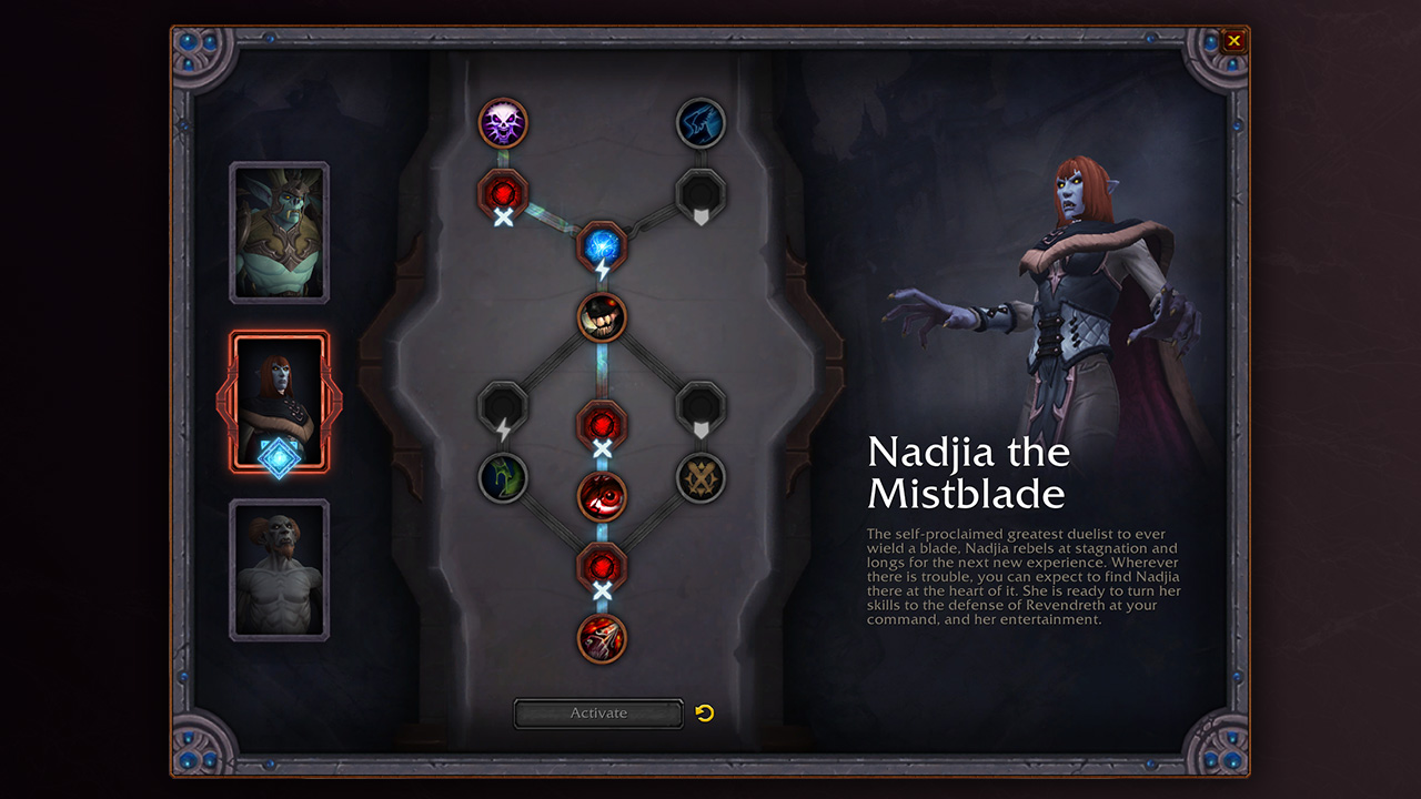 Nadjia la Lame fantôme, meilleure duelliste autoproclamée, déteste l’immobilité et n’adore rien tant que les nouvelles expériences. S’il y a du grabuge quelque part, vous trouverez à coup sûr Nadjia au cœur de l’action. Elle vous offrira volontiers ses services pour défendre Revendreth et tromper l’ennui.