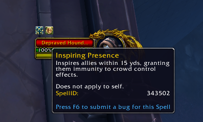 Des créatures aléatoires seront donc infectées par la Présence inspirante et leur infection sera mis en lumière par une lueur en or autour d'elles. Toute autre créature à moins de 15 mètres aura Inspired (Inspiré), les rendant immunisées aux contrôles de foules.