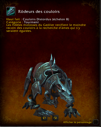Pour terminer chaque étage des Couloirs distordus, cela prendre environ 1 heure à 1h et 30 minutes. Ainsi, pour les 8 étages, vous prendrez entre 8 et 12 heures pour tous les terminer. Vos efforts ne seront pas vains, puisque cette monture est liée au compte, signifiant que vous pouvez la monter sur vos autres personnages.