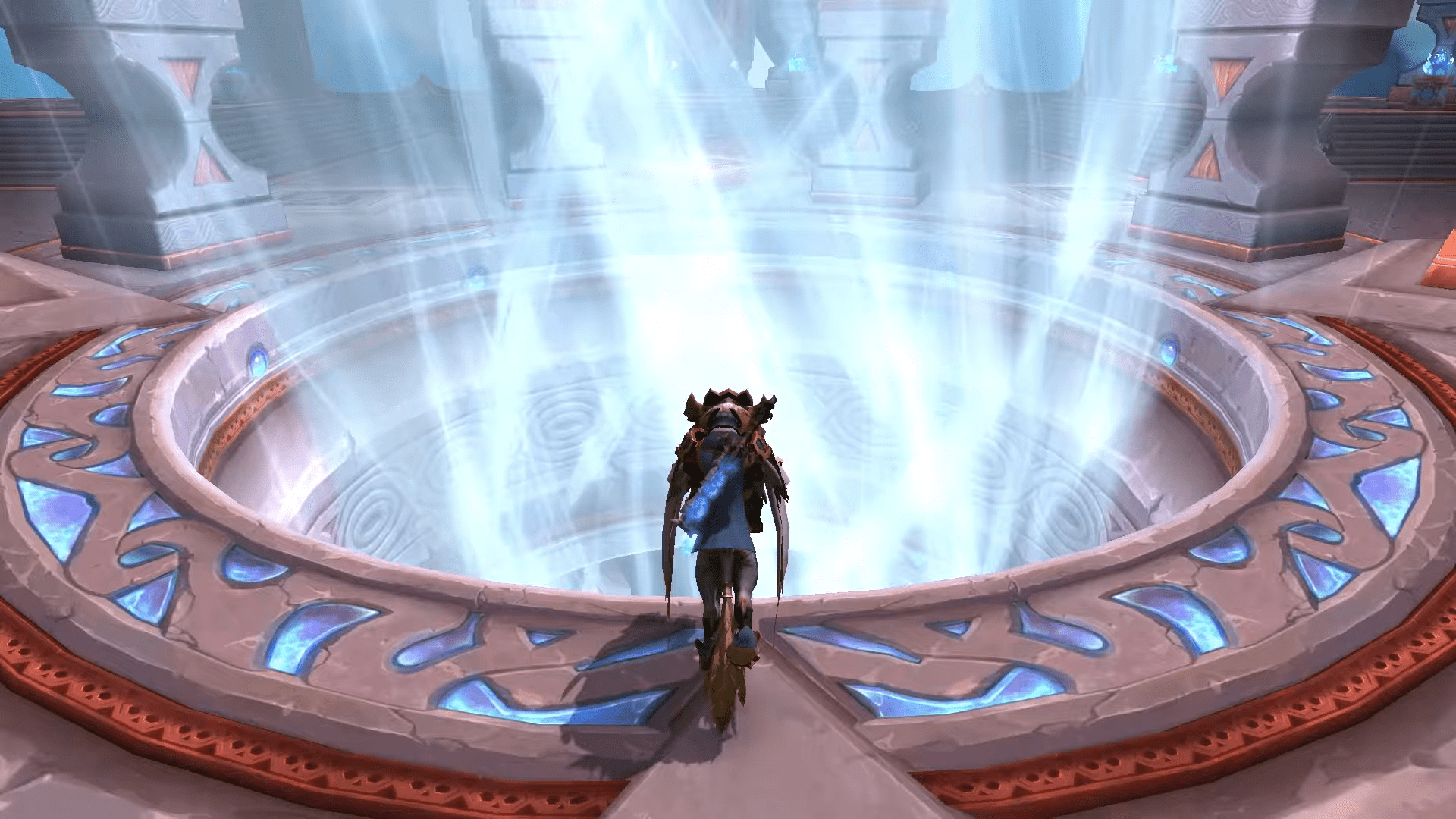 Comme vous pouvez le constater, vous devez sauter dans l'énorme faisceau de magie (appelé la Rivière des âmes et traversant le noyau de la cité) se trouvant au centre même d'Oribos, plus précisément à l'Anneau des destins. S'ensuivra la fameuse cinématique dont je vous parlais plus haut, puis votre arrivée dans le royaume du Geôlier.