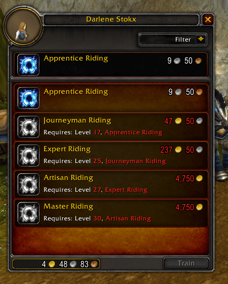 L'acquisition de la compétence "Apprenti Cavalier" n'est pas modifiée : en effet, elle ne nécessite aucun niveau requis pour être achetée et coûte seulement 9