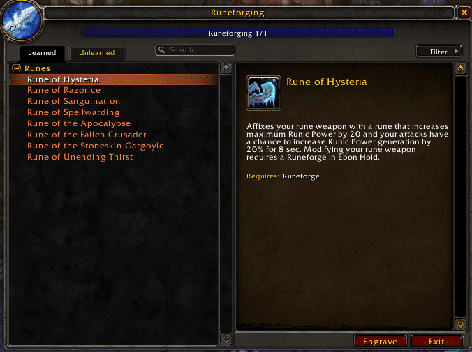 Rune d’hystérie (Rune d'hystérie) : Ajoute à votre arme une rune qui augmente votre puissance runique de 20. Vos attaques ont une chance d’augmenter votre régénération runique de 20% pendant 8 secondes.