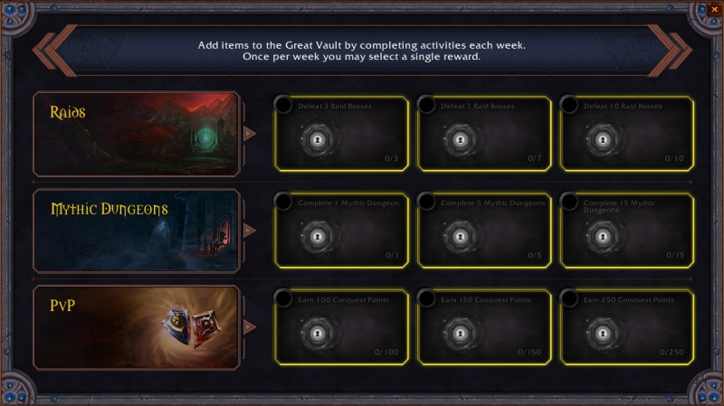 Dorénavant, toute activité de Mythique +, de raid et JcJ faites pendant la semaine donnent l'accessibilité à des choix de pièces d'armures additionnelles et vous avez la possibilité de suivre votre progression via l'interface qui lui est dédiée.