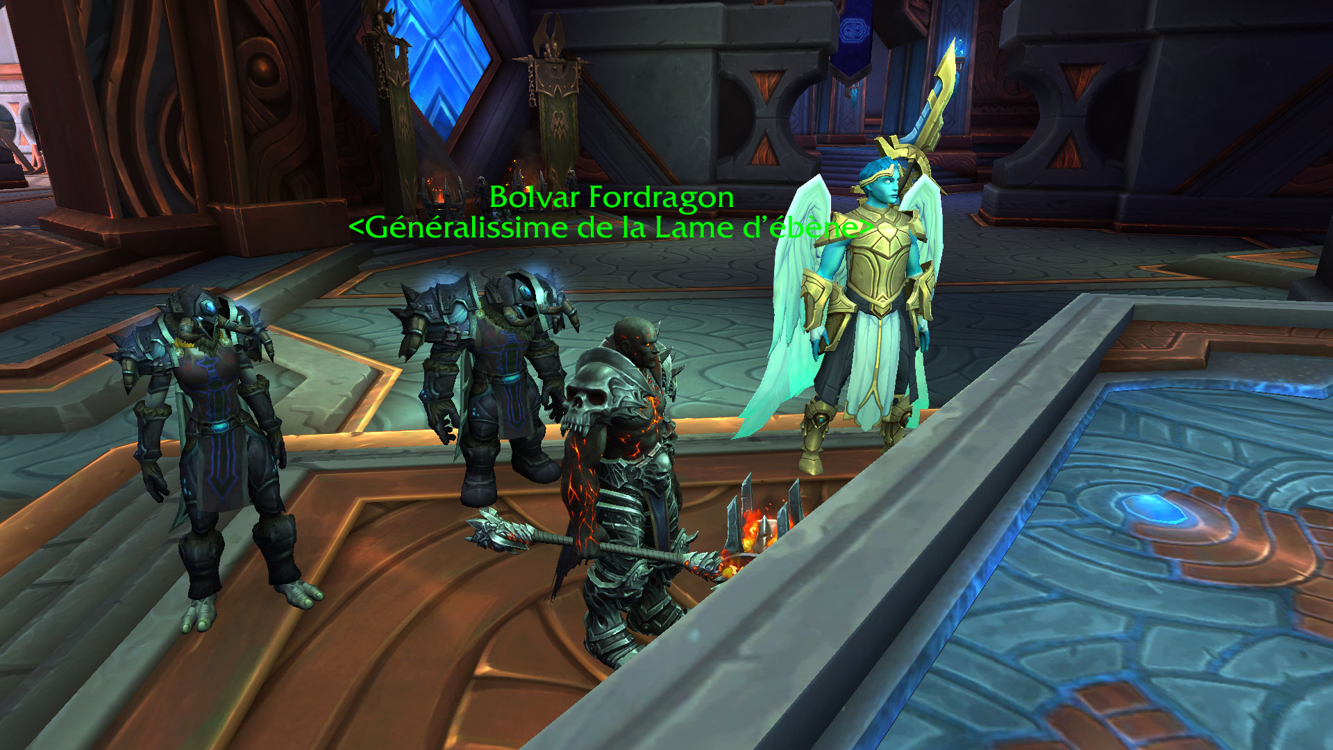 Tout d'abord, sachez que Bolvar Fordragon est arrivé dans cette ville. En effet, il est à présent Généralissime de la Lame d'ébène. Il est entouré de deux Chevaliers de la Mort (une Worgen et un Orc) ainsi que d'un Kyrian.
