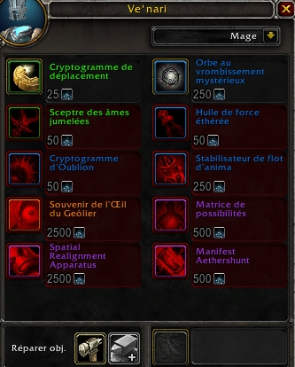 - Spatial Realignment Apparatus : Ajoute un emplacement de gemme à un objet de Shadowlandsqui n'en possède pas déjà. Peut être utilisé sur les Heaumes, Cous, Brassards, Ceintures ou Anneaux.