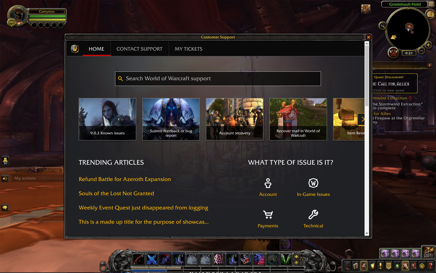 Plus efficace que jamais, notre section d’aide en jeu vous permettra de faire des recherches parmi des milliers d’articles et d’utiliser des outils géniaux pour récupérer des objets supprimés ou désenchantés, restaurer un personnage de World of Warcraft ou débloquer un personnage coincé sans attendre l’intervention d’un Maître de jeu. Des ressources faciles d’accès seront également regroupées en haut de page : problèmes connus, dernières actualités et services automatiques. Les articles populaires vous permettront de passer en revue les problèmes connus d’un coup d’œil et vous fourniront des solutions afin que votre campagne en Ombreterre se déroule sans encombre.