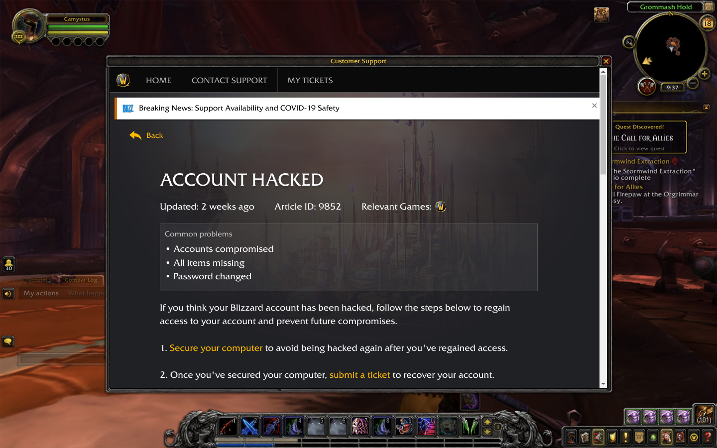 Blizzard a publié il y a quelques instants un guide de soutien pour Shadowlands comprenant la façon dont vous pouvez obtenir de l'aide en jeu ou la récupération de votre compte si vous avez des problèmes de connexion ou d'oublie de mot de passe.