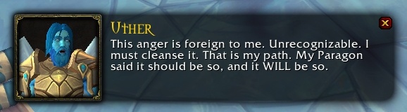 Uther : Cette colère m'est étrangère. Inconnaissable. Je dois la purifier. C'est mon chemin. Mon Parangon a dit qu'il devrait en être ainsi, et il en sera ainsi.