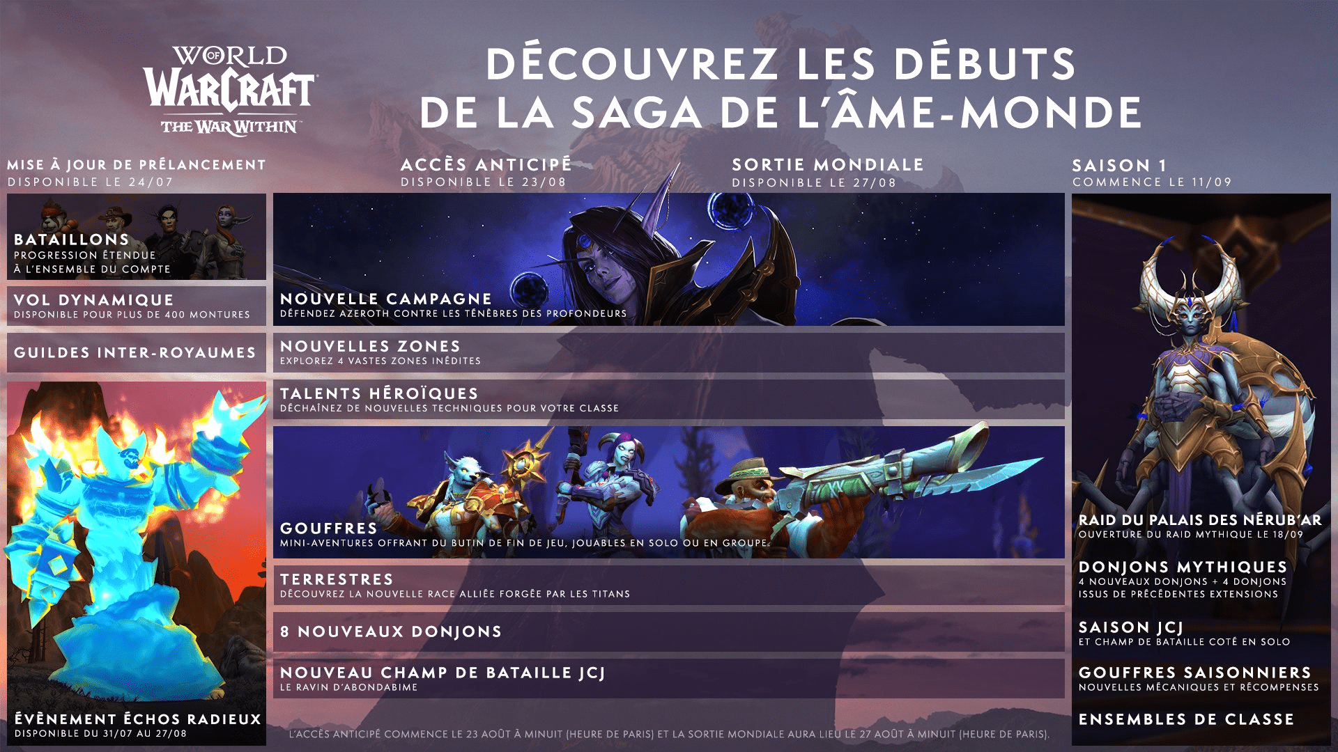 Le studio a dévoilé dans un post sur X une nouvelle feuille de route du prélancement de The War Within et des deux premières semaines de sortie de l'extension. Pour rappel, cette dernière sortira le 27 août à minuit, heure de Paris. Elle vous permettra d'explorer un nouveau continent, Khaz Algar, situé entre le sud de Kalimdor et l'ouest de la Pandarie.