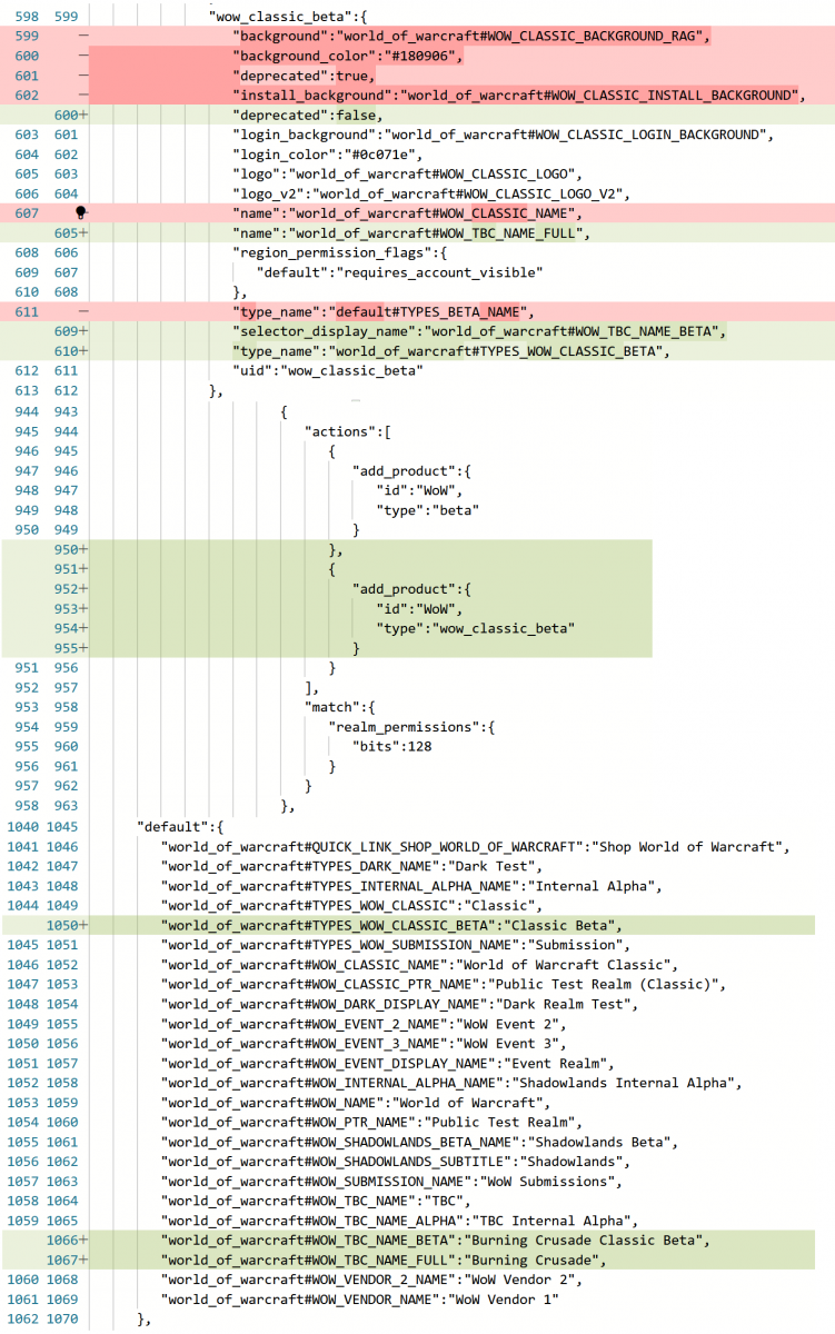 Bien que nous n'ayons pas encore de date de sortie pour le lancement de la bêta de TBC : Classic, cette mise à jour signifie que la bêta est un peu plus proche. Vous trouverez ci-dessous le code actuel de Blizzard, ainsi qu'une comparaison entre l'ancien et le nouveau code, avec les ajouts en vert et le code supprimé en rouge.