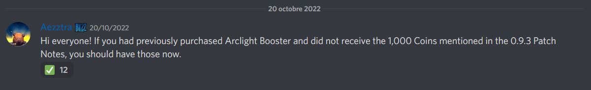 Sur le serveur Discord du jeu, Aezztra a annoncé le 20 octobre qu'un problème rencontré avec le déploiement de la mise à jour 0.9.3 a été résolu. En effet, si les joueurs et les joueuse éligibles à la bêta avaient déjà acheté l'Arclight Booster et qu'ils ou elles n'ont pas reçu les 1 000 pièces d'or mentionnées dans les notes du patch de la version 0.9.3, ils ou elles devraient les avoir maintenant.