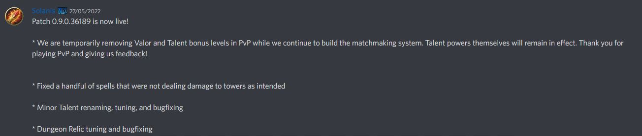 - Les développeurs suppriment temporairement les niveaux bonus de Vaillance et de Talent en JcJ pendant qu'ils continuent à construire le système de matchmaking en JcJ. Les pouvoirs de talent eux-mêmes resteront en vigueur.