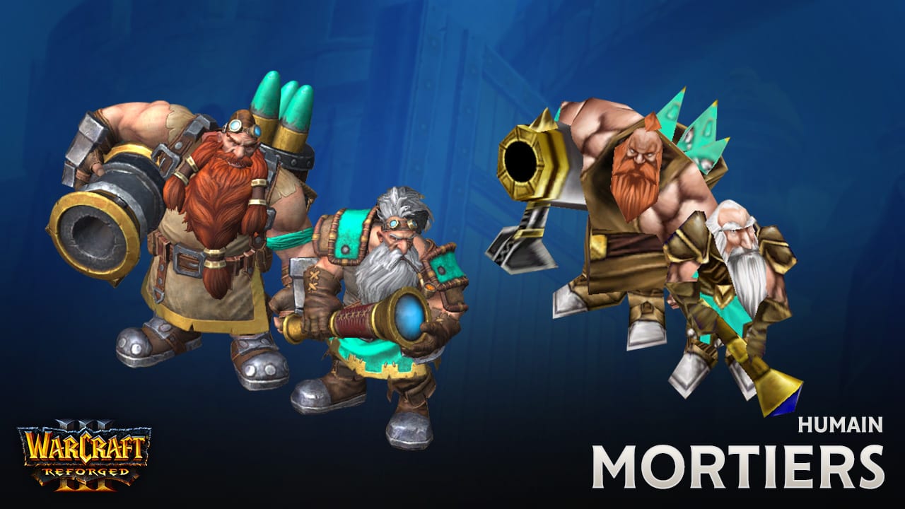 Ensorceleuse Aussi terrifiantes que vaniteuses, les ensorceleuses elfes renversent le cours des batailles comme bon leur semble en ralentissant le temps autour de leurs ennemis ou en les transformant en moutons sans défense. Beeeh ! La nouvelle ensorceleuse affiche fièrement son allégeance et l’œil de Dalaran sur sa cape, et revêt une armure somptueuse et raffinée. La ensorceleuse ne se contente pas de manipuler l’espace-temps : elle tient à le faire tout en élégance, et n’hésitera pas à jeter un coup d’œil à ses ongles pour s’assurer que son style est aussi dévastateur que ses sorts. Mortiers Téméraires, les unités de mortiers se composent de véritables maîtres des explosifs qui partagent tous la même passion : réduire les fortifications adverses en poussière. Pour recréer les unités de mortiers, les développeurs se sont penchés sur les croquis réalisés par Samwise Didier pour la sortie du Warcraft III original. Celles-ci illustraient ce à quoi l’équipe des mortiers était censée ressembler : un commando d’élite spécialiste de la démolition. Ce nouveau modèle donne enfin vie à cette idée, avec d’impressionnants obus de mortier, de lourdes pièces d’artillerie et un équipement protecteur. Chevaucheur de griffon Les membres du clan des Marteaux-hardis du Nid-de-l’Aigle, armés de puissants marteaux-tempête qui commandent à la foudre, chevauchent d’implacables et fiers griffons pour instiller la peur dans le cœur des ennemis de l’Alliance. Sur le modèle original, la monture était beaucoup plus proéminente par souci de clarté visuelle sur un champ de bataille parfois chaotique, mais le nouveau modèle du chevaucheur de griffon apporte beaucoup plus de détails au Nain lui-même. Si vous zoomez suffisamment, vous reconnaîtrez même les tatouages caractéristiques des Marteaux-hardis sur les chevaliers torse nu. Une petite targe et un imposant marteau complètent l’équipement de ce redoutable guerrier.