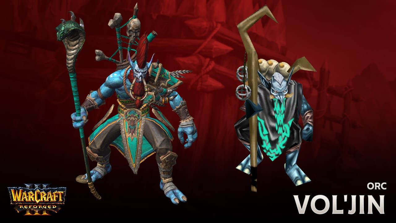 Warcraft III. Le nouveau modèle de Rokhan conserve sa barbe emblématique, mais se pare d’un imposant masque et d’une armure de bois plus détaillée. De son côté, Vol’jin gagne de terrifiantes peintures de guerre dignes d’un chef sombrelance.